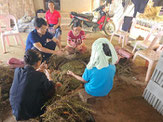 そんな民族の伝統を継続させるために活動するラオス人もいます。彼女は刺繍や裁縫が得意なモン族出身ですが、カム族と協力して木の繊維を加工して現代風のポーチや帽子を生産しています。染色方法は天然由来で、泥につけて染色を行うこともあります。