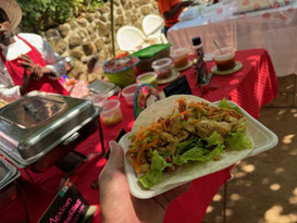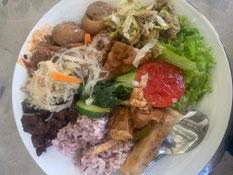 見た目は全く映えませんが、ふんわりとした魚の身、ザクザクとしたおかきの食感、鼻を抜ける香草の香り、全てが調和した一口です。焼き魚をほぐしたりと作るのに手間がかかるため、レストランなどでは見かけず、あくまで家庭料理のようです。初めて元生徒の家に行った時にこの料理が出され、見た目からは想像のできない美味しさに驚きました。今回も私が好きだからと作ってくれたようでお腹いっぱい食べさせてくれました。そして、私がたくさん食べる事を見越しておかわりも用意されてました!エアコンもなく羽虫が飛び。決して快適とはいえない屋外の食事でしたが、今まで感じたことのないほどの多幸感にあふれた昼下がりでした。